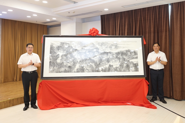 温建飞与陈永华共同为学校向南浔区捐赠水墨画《袅袅云烟抚浔溪》揭幕,此幅作品由我校艺术学院王凤欣老师以南浔古镇中代表性景物为主题创作完成。