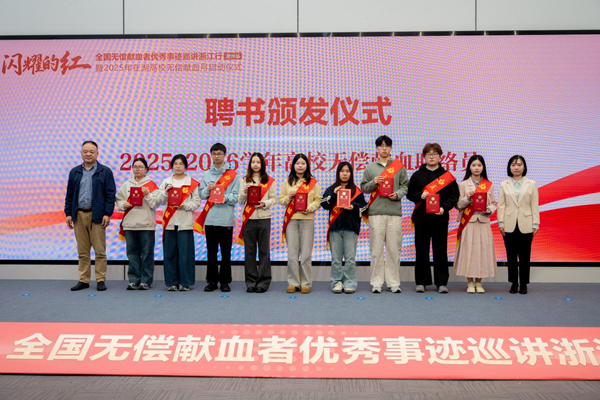 活动现场,黄桂众、谢作灵为在湖各高校无偿献血联络员颁发聘书,进一步健全高校无偿献血工作联络机制。我校学生代表、全国无偿献血奉献银奖获得者楼炯楠同学宣读了《致全省青年学子的无偿献血倡议书》,发出“捐献热血、传递希望”的号召。